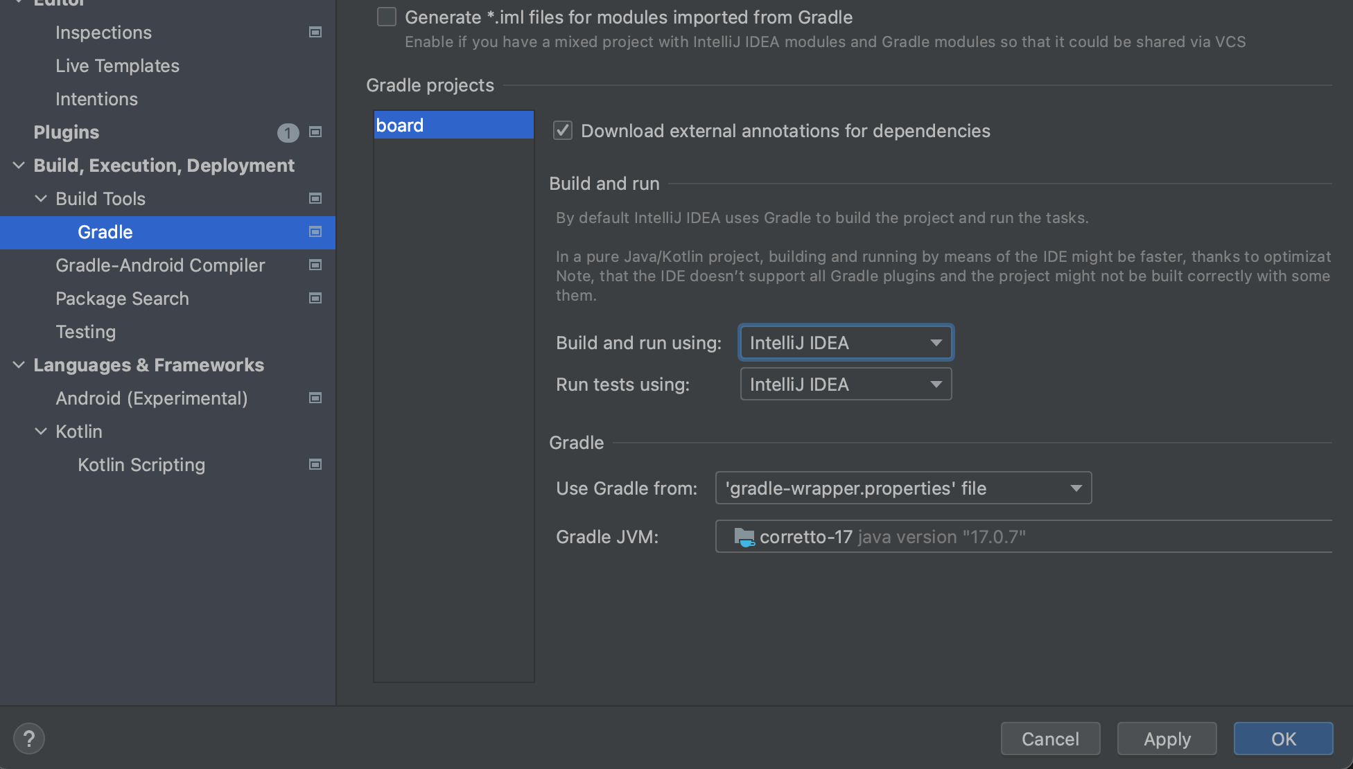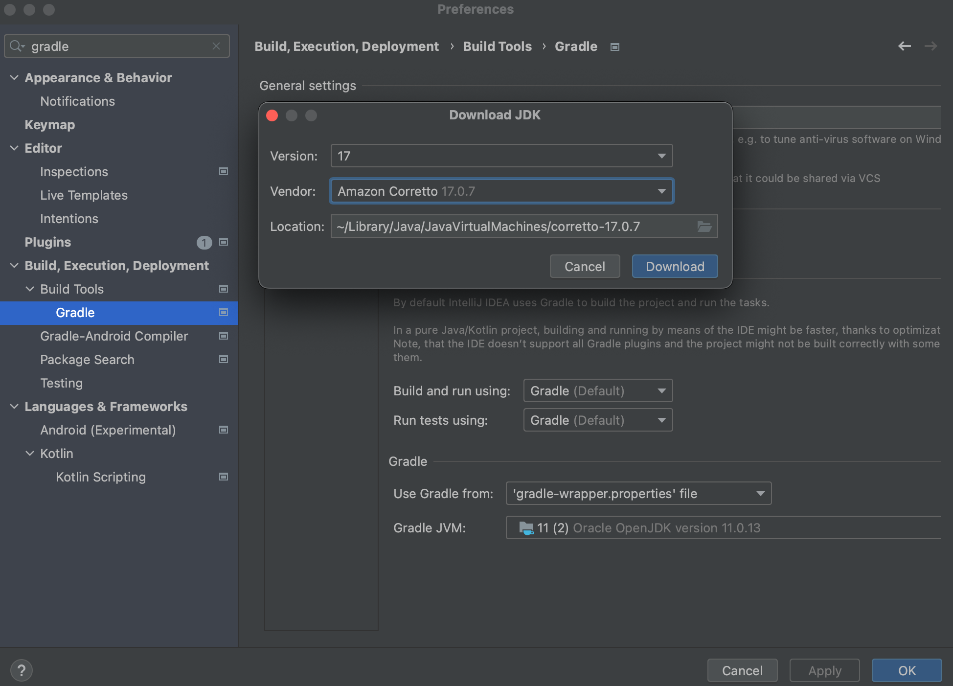 1. seetings -> gradle 검색 -> Gradle JVM 확인 -> 17 버전이 아니라면 17 버전 다운받기